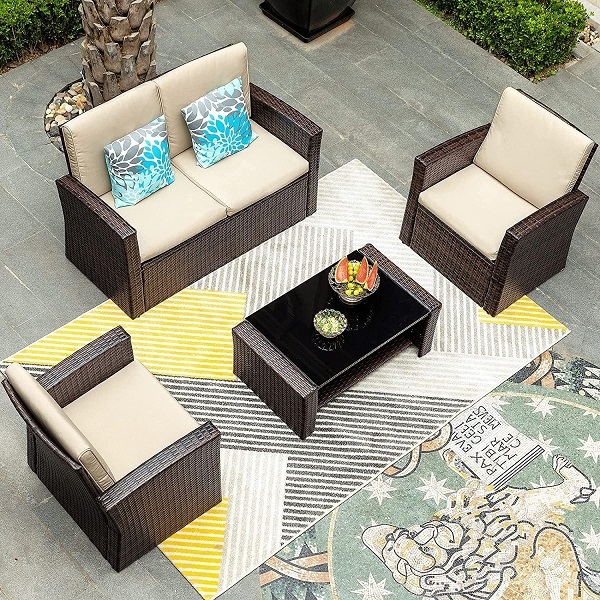 Material:Steel frame+ PE rattan+cushion+5mm tempered glass